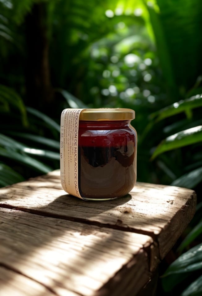 El mucílago de la fruta del cacao en su mayoría es desperdiciada en los procesos cacaoteros para hacer chocolate, sin embargo, una reducción al calor puede convertirla en una miel que concentra los sabores y propiedades de la fruta del cacao.